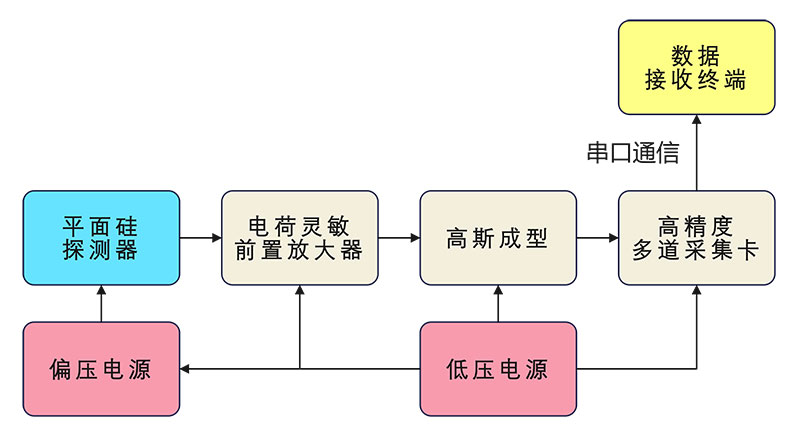 单路 α谱采集方案:基于半导体硅探测器的 α 能谱测量系统,包含信号采集、电荷灵敏前置放大、高斯整形、谱线转换与通信等整套方案设计。用于 α 信号的数字成型及谱线收集。